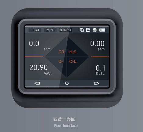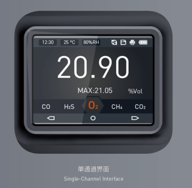 2.31寸高清彩屏,顯示實時濃度、報警、時間、溫度、濕度、存儲、通信、電量、充電狀態、濃度單位、氣體分子式、氣體名稱等信息;菜單界面采用高清仿真圖形顯示各個菜單的功能名稱。