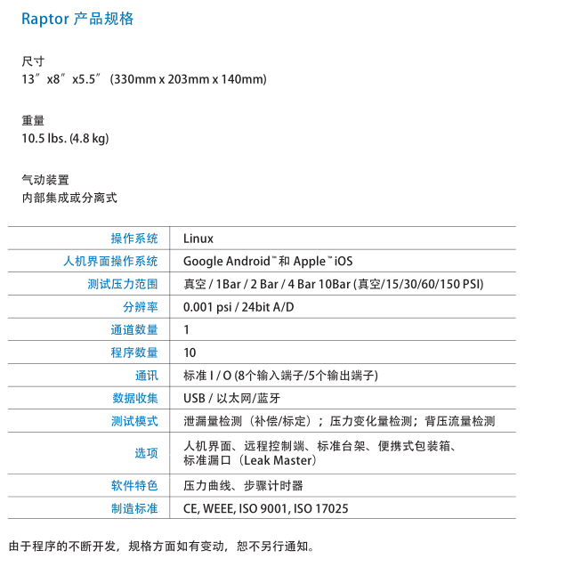 Raptor系列測(cè)試儀在壓力變化模式、補(bǔ)償/校準(zhǔn)模式或背壓流量下均可測(cè)試。Raptor的10個(gè)測(cè)試程序可讓您在面對(duì)不同的部件類(lèi)型、型號(hào)和配置時(shí)都能游刃有余。